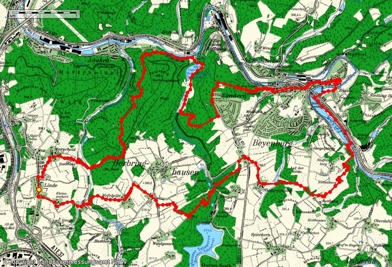 in Richtung Beyenburg. Wir überqueren die L 411 und gehen über Niedersondern nach Rottland, wo wir auf den Weg A2 in Richtung Nordosten wechseln. Die engen Täler erinnern an das Allgäu.