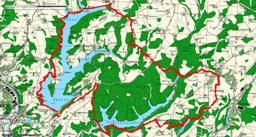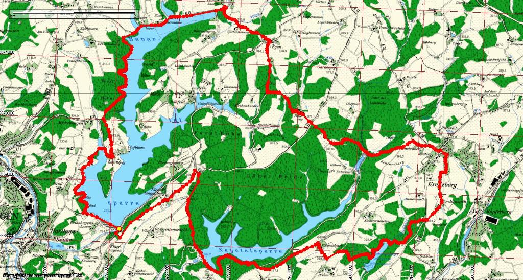 bis zur Neyetalsperre. Hier verlassen wir den X-Weg, gehen um den See nach Osten und verlassen dann den Wald in Richtung Süden (Hammbüchen). Wir gehen weiter parallel zur Talsperre nach Fliegeneichen und dann