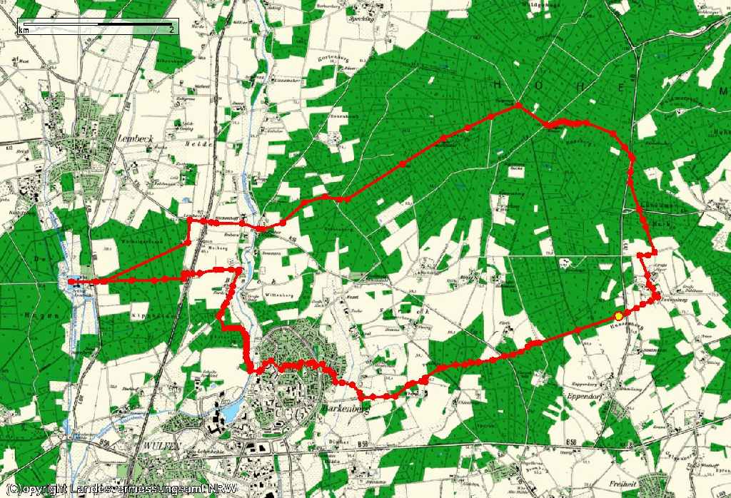 abbiegen. Wir erreichen die Straße K55, der wir ca. 500 km am Bahnhof Lembeck vorbei bis zur Mindlichen Mühle folgen. Hier finden wir den Weg X2, der uns kontinuierlich ansteigend zum Feuerwehrturm